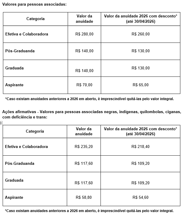 Todos os pagamentos devem ser realizados via área da pessoa inscrita e as formas de pagamento são: PIX, cartão de crédito (em até 6x sem juros) e boleto; - Após o processamento de seu pagamento, em até 3 dias úteis, o recibo de pagamento e a carteirinha estarão disponíveis na área restrita da pessoa associada, no menu “Anuidades”.